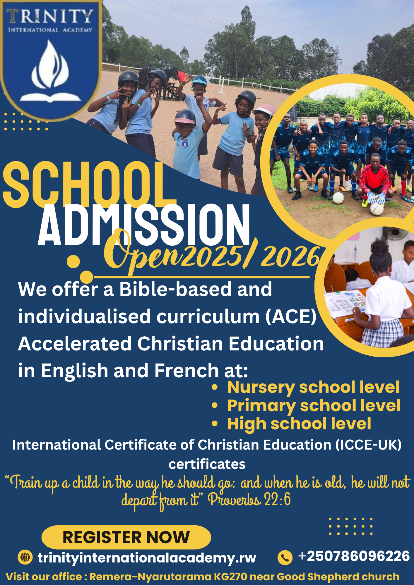 Trinity International Academy (TIA) is a Christian school offering Accelerated Christian Education (ACE) a Bible based academic curriculum. We offering Nursery (age 2-3 years), Primary School and High School levels. The school started in 2014 and is governed by a Board of Directors who set strategic vision and guidance in management of the school. Trinity International Academy (TIA) has since gained a reputation in the city of Kigali for its unique focus on fostering individualised, Christ like character and academic Excellence development.
